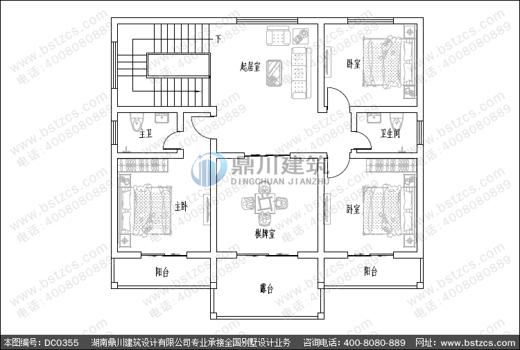 二 層: 起居室、棋牌室(附露臺)、臥室(附衛生間,陽臺)、臥室(附陽臺)、臥室、衛生間