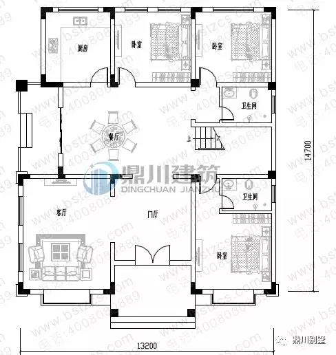 一 層: 門廳、客廳、臥室(附衛(wèi)生間)、臥室、廚房、餐廳、衛(wèi)生間