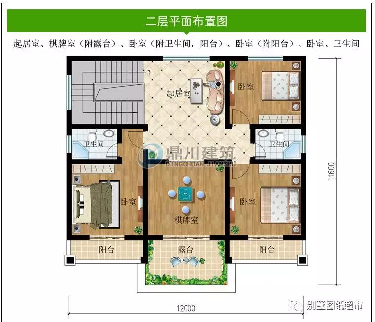 二 層:客廳、臥室(附衛生間)、臥室、兒童房、棋牌室、衛生間、露臺