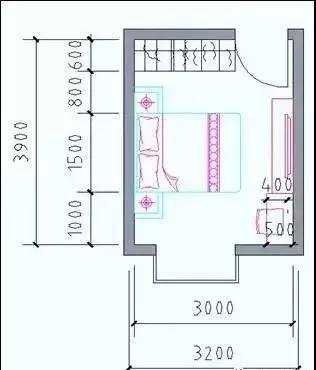 凈寬:床長度2000mm+臥室門1000mm,開間≥3000mm;