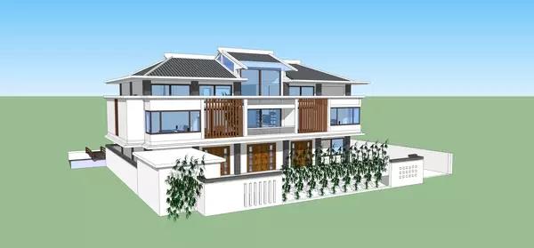 可以看到是個 3 層小樓,5 開間布局,場地西南角設小屋一間,圍墻全包圍,正前方為綠籬隔斷。