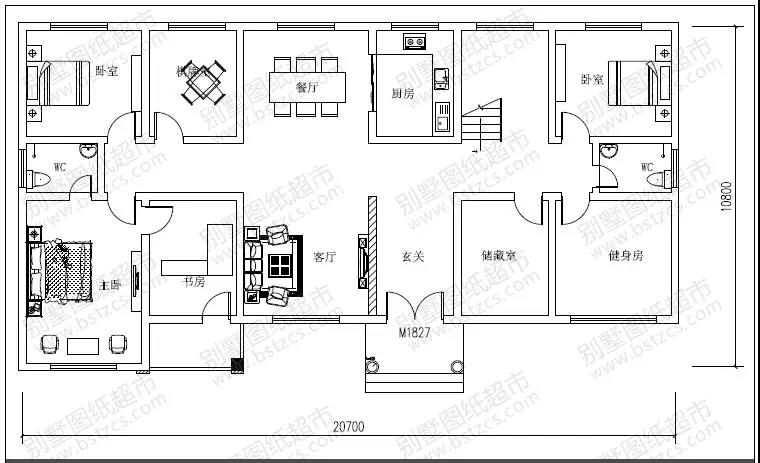 一 層:客廳、主臥(附衛生間,書房附陽臺)、2臥室、棋牌室、儲藏室、健身房、廚房、餐廳、衛生間