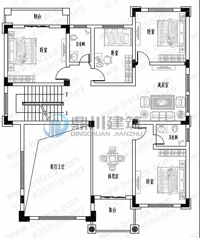 二 層:休息廳、臥室(附衛生間,陽臺)、臥室(附陽臺)、臥室、衛生間