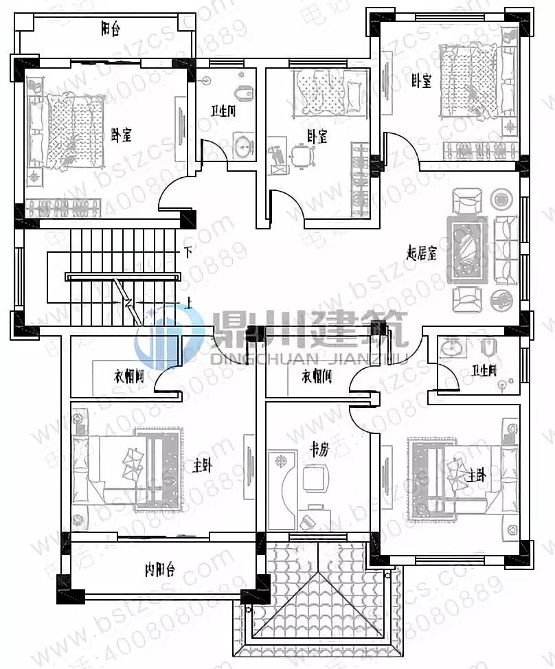 二 層:起居室、臥室(附衛生間,陽臺)、臥室(附陽臺)、臥室、書房、衛生間