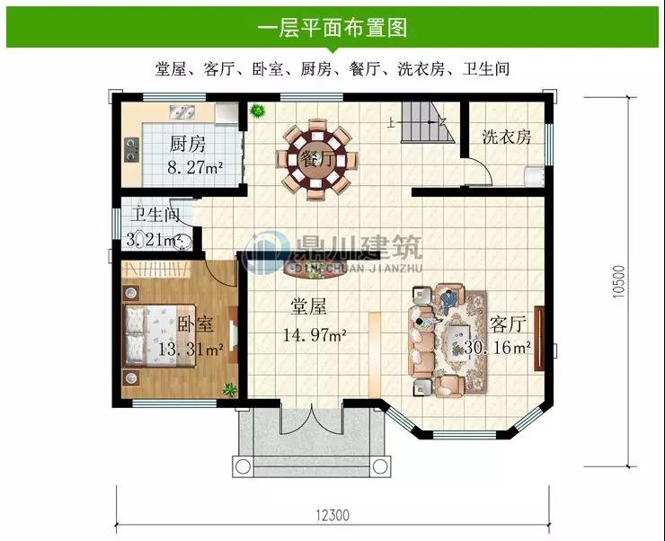 一層功能設(shè)計(jì):堂屋、客廳、臥室、廚房、餐廳、洗衣房、衛(wèi)生間。