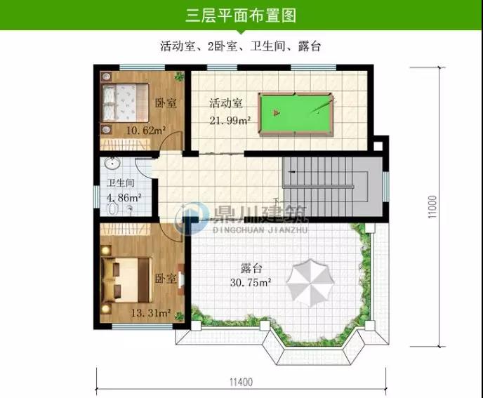 二層設有三間臥室,一個起居室,一個書房,為主要休息和工作的區域,此款戶型實用型高,很適合農村建!
