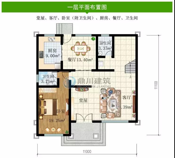 一層設有堂屋、客廳、臥室(附衛生間)、廚房、餐廳、衛生間。
