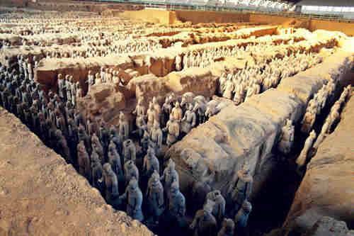 秦始皇陵位于西安以東30公里的驪山北麓,南依驪山,北臨渭水。高大的封冢在巍巍峰巒環抱之中與驪山渾然一體,景色優美,環境獨秀。秦始皇陵于公元前246年,秦始皇初即位開工修建,前后歷時38年,動用徭役、刑徒72萬余人。這位叱咤風云的曠世君主不僅為后人留下了千秋偉業,還留有這座神秘莫測的皇家陵園。陵園建制仿都邑,陵墓周圍呈回字型,筑有內、外兩重城垣,目前探明的大型地面建筑為寢殿、便殿、園寺吏舍等基址。