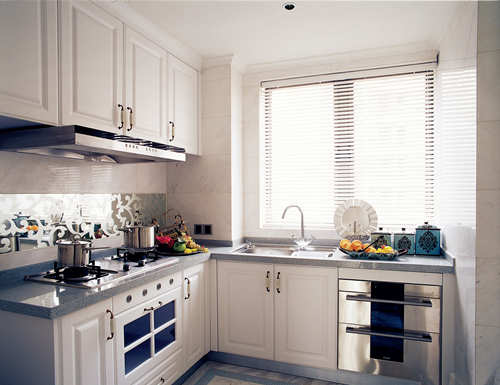 選擇使用多門組合方式,它可以非常人性化的為廚房進行海量收納。這個廚房多采用嵌入式設計的家具,一體式多門組合櫥柜和嵌入式的烤箱和洗碗機,加上合理的功能區域布置,使整個廚房井然有序,實用性強大。