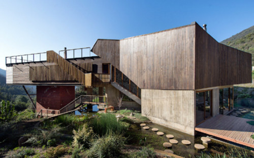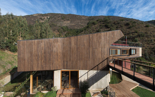 這棟幾何形住宅,位于智利。室內各功能空間,面朝山景,視野開闊。主要由鋼筋、木材與混凝土材料構成。面積253㎡,現居住著一個六口之家。