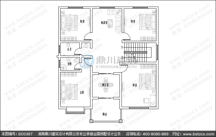 二 層:起居室、娛樂室(附陽臺)、臥室(附衛生間)、3臥室、衛生間