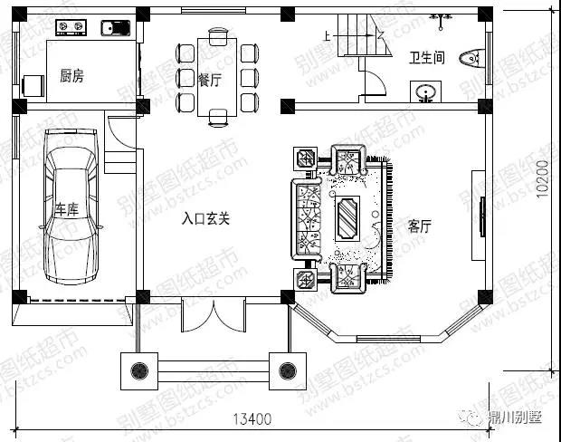一 層:入口玄關(guān)、客廳、廚房、餐廳、衛(wèi)生間、車(chē)庫(kù)