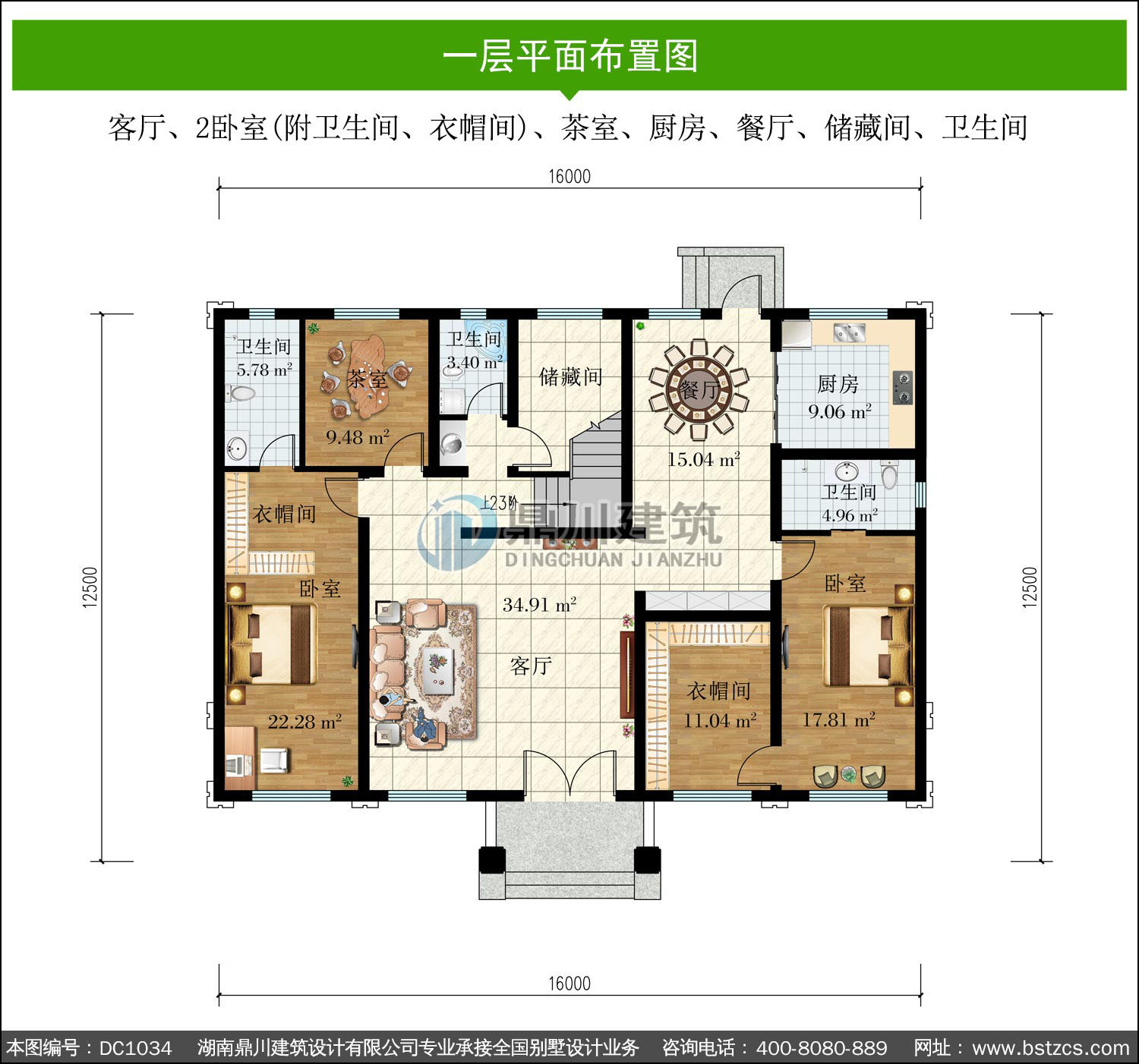 一 層: | 客廳、2臥室(附衛(wèi)生間、衣帽間)、茶室、廚房、餐廳、儲(chǔ)藏間、衛(wèi)生間 | |||