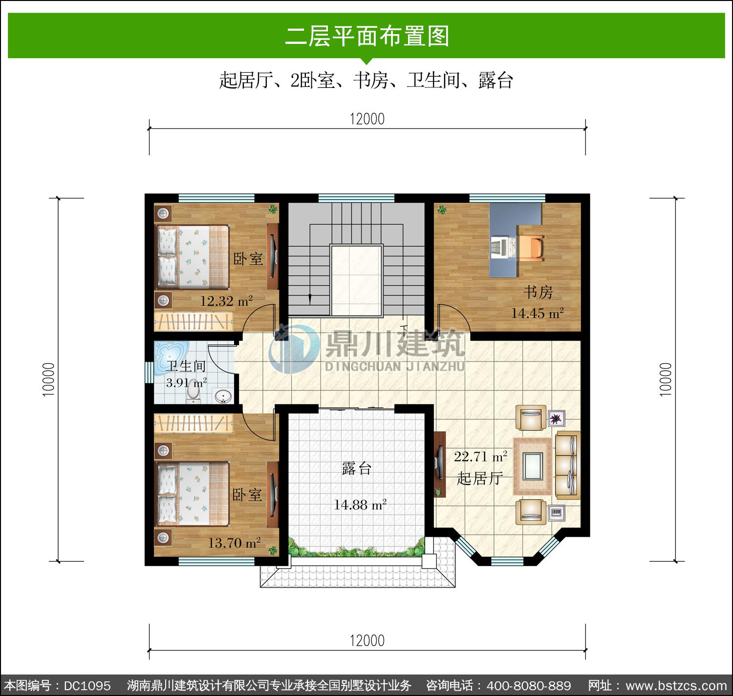 二 層: 起居廳、2臥室、書房、衛生間、露臺