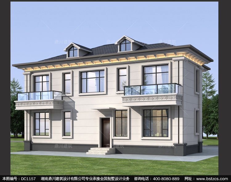 新中式二層帶陽臺別墅圖紙及效果圖_農村自建別墅設計,鼎川建筑