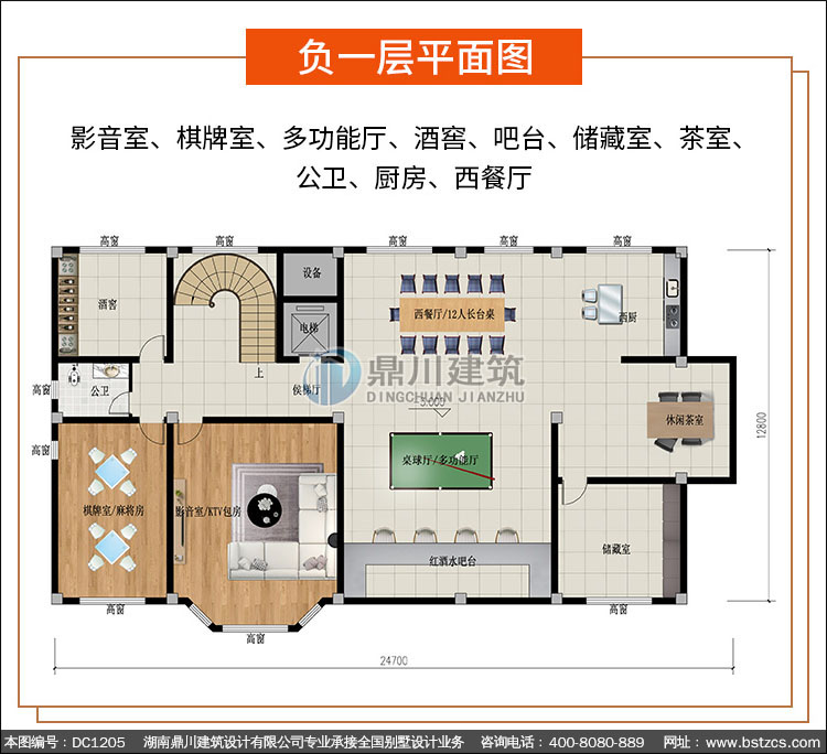 負一層: | 影音室、棋牌室、多功能廳、酒窖、吧臺、儲藏室、茶室、公衛、廚房、西餐廳 | |||