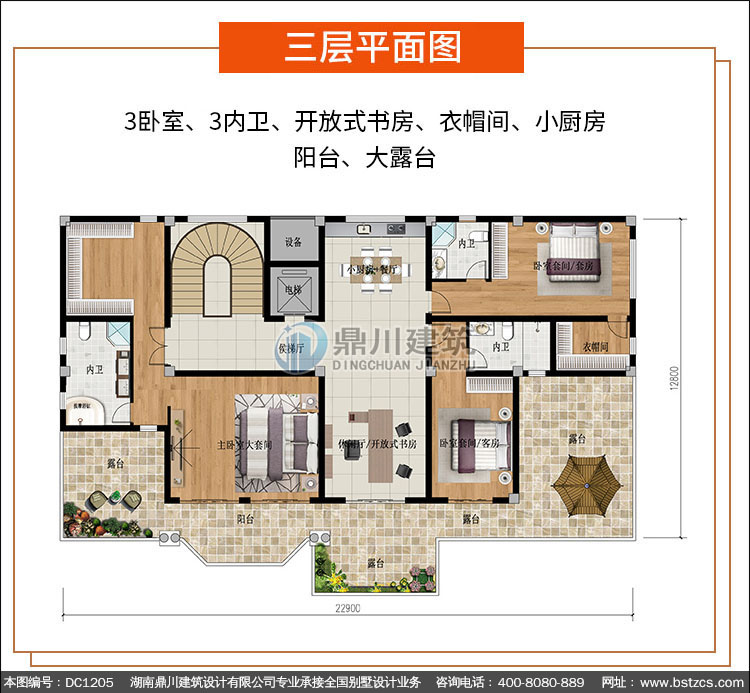 三 層: | 3臥室、3內衛、開放式書房、衣帽間、小廚房陽臺、大露臺 |
