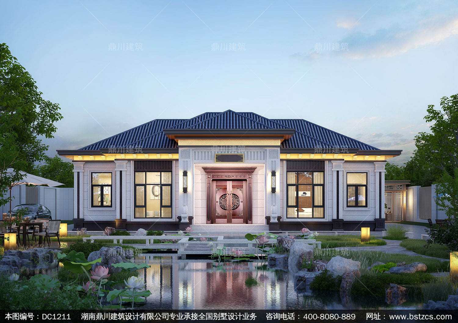 新中式一層別墅施工圖紙及外觀效果圖_農村自建別墅設計,鼎川建筑