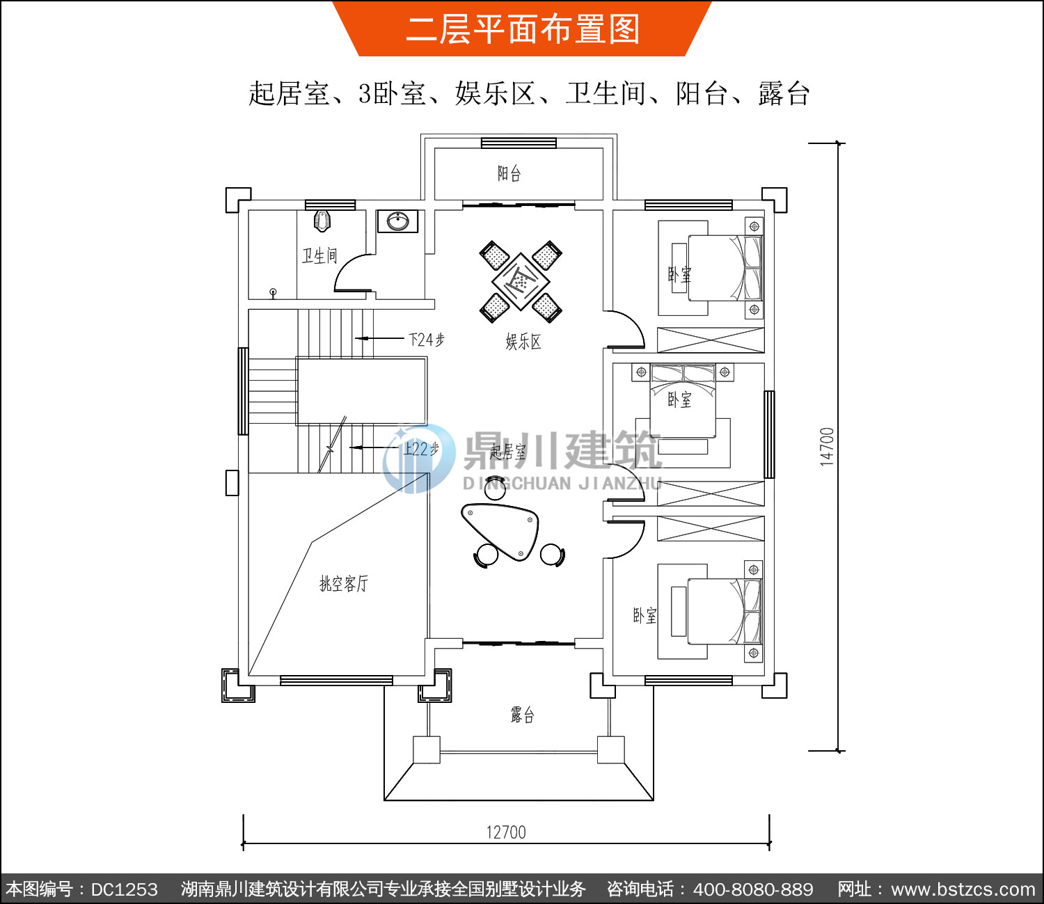 二 層: | 起居室、3臥室、娛樂區(qū)、衛(wèi)生間、陽臺、露臺 | |||