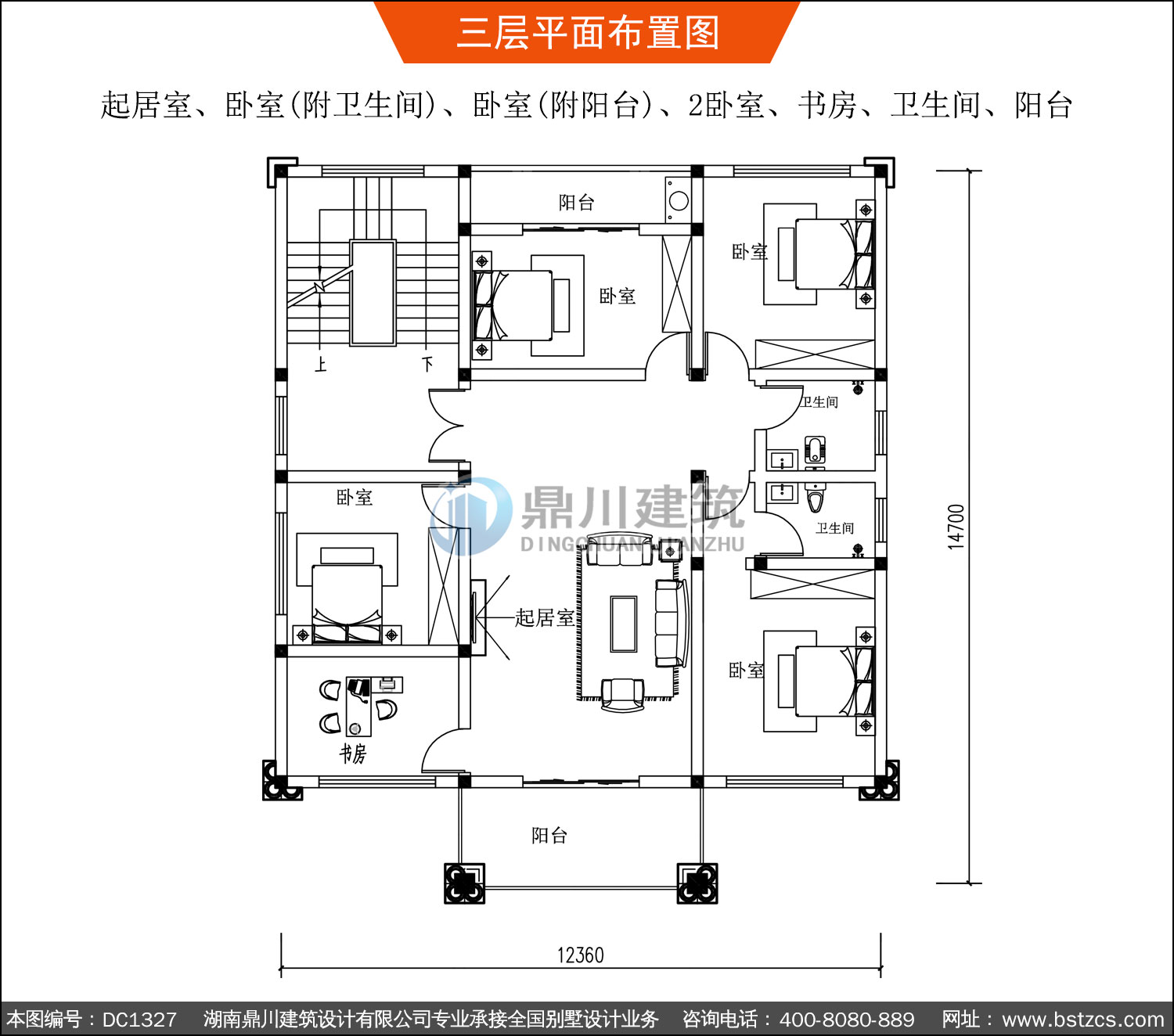 三 層: | 起居室、臥室(附衛生間)、臥室(附陽臺)、2臥室、書房、衛生間、陽臺 | |||