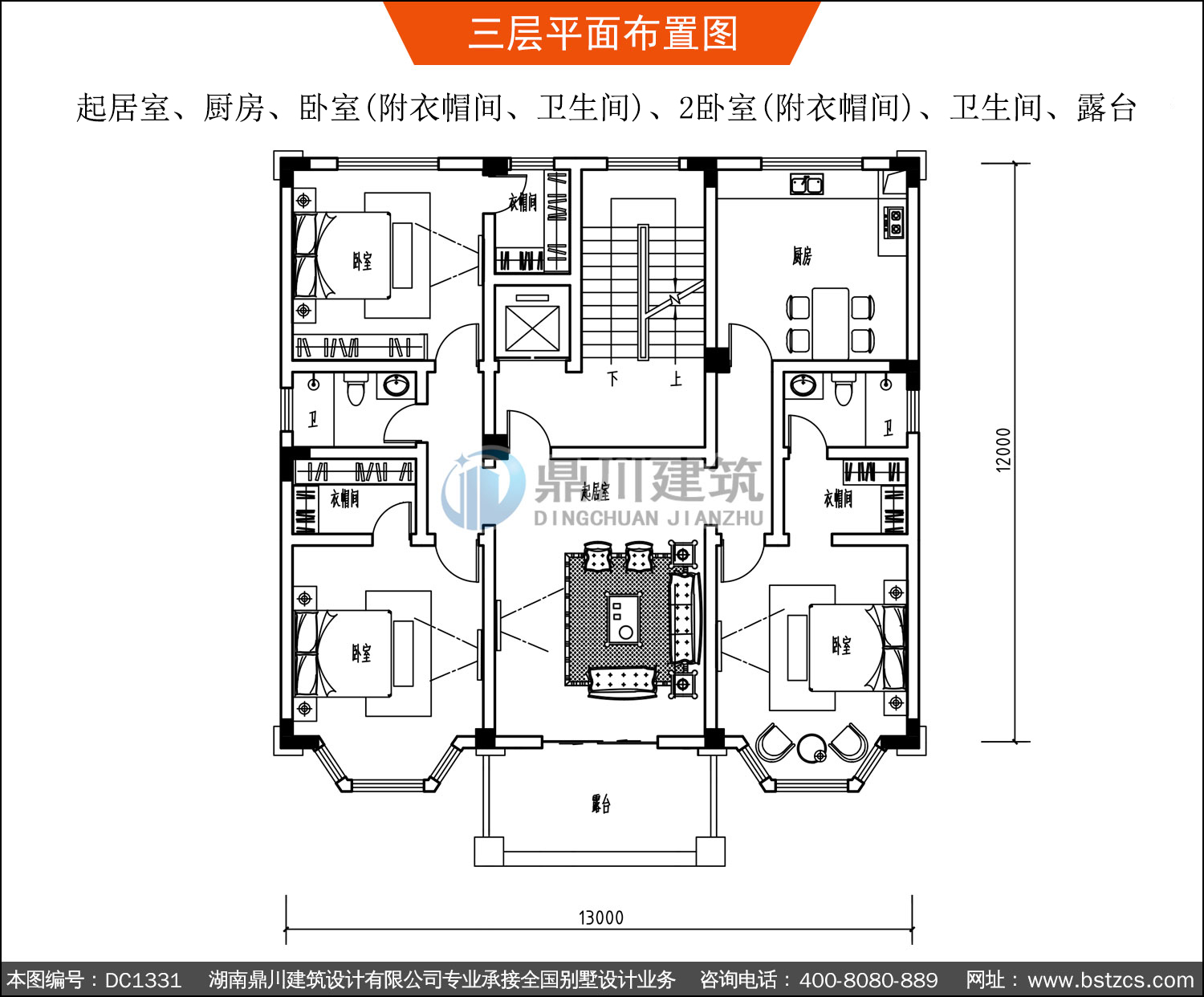 三 層: | 起居室、廚房、臥室(附衣帽間、衛生間)、2臥室(附衣帽間)、衛生間、露臺 | |||