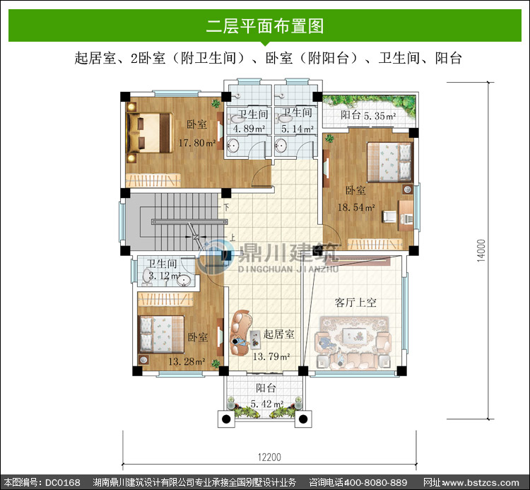 二 層: | 起居室、2臥室(附衛生間)、臥室(附陽臺)、衛生間、陽臺 | |||