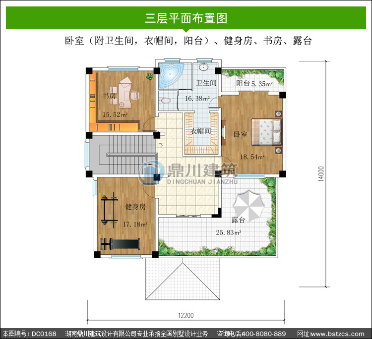 三 層: | 臥室(附衛生間,衣帽間,陽臺)、健身房、書房、露臺 |