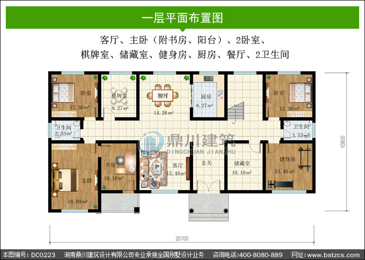一 層: | 客廳、主臥(附書房、陽臺)、2臥室、棋牌室、儲藏室、健身房、廚房、餐廳、2衛(wèi)生間 | |||
