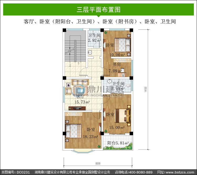 三 層: | 客廳、臥室(附陽臺、衛生間)、臥室(附書房)、臥室、衛生間 | |||