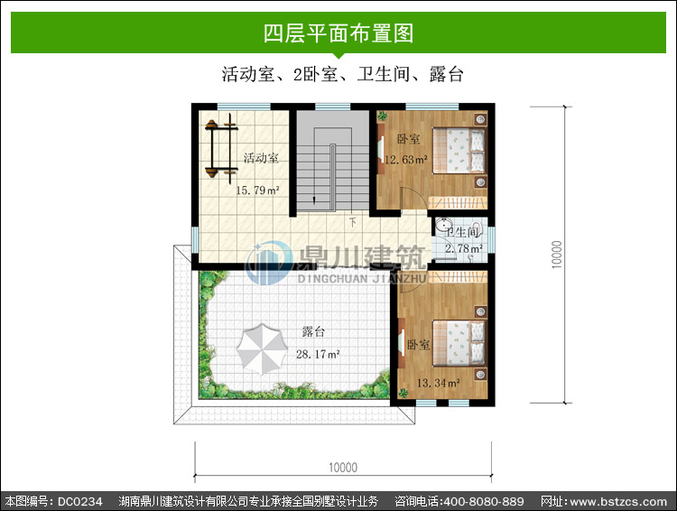 四 層: | 活動(dòng)室、2臥室、衛(wèi)生間、露臺(tái) |