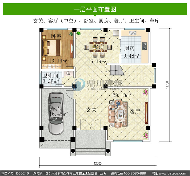 一 層: | 玄關、客廳(中空)、臥室、廚房、餐廳、衛生間、車庫 | |||