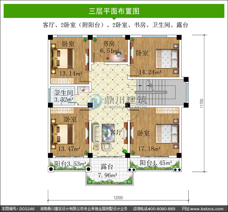 三 層: | 客廳、2臥室(附陽臺)、2臥室、書房、衛生間、露臺 | |||