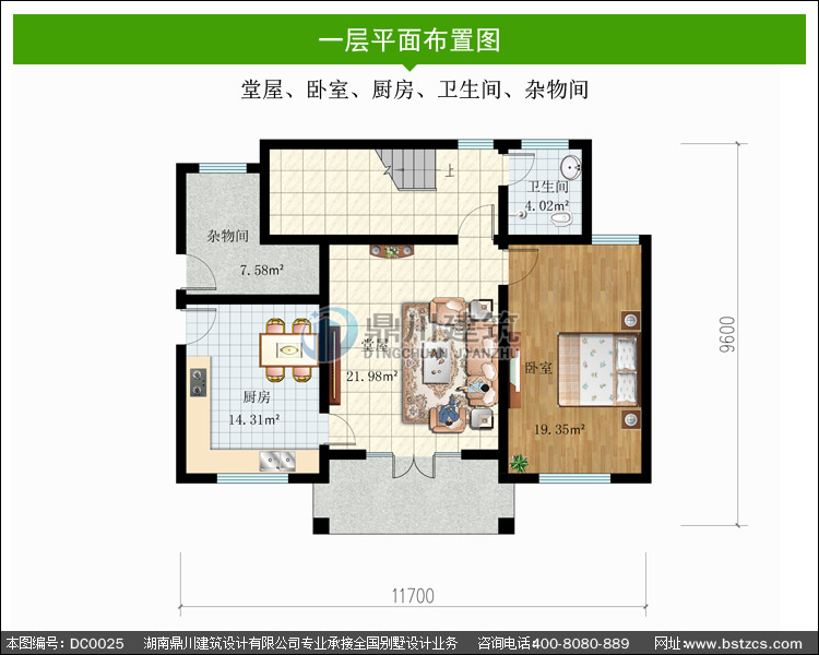 一 層: 堂屋、臥室、廚房、衛生間、雜物間