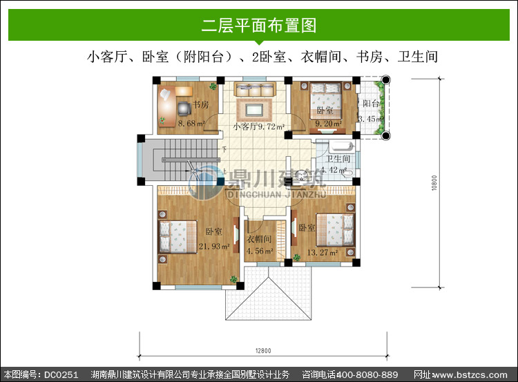 二 層: | 小客廳、臥室(附陽臺)、2臥室、衣帽間、書房、衛生間 | |||
