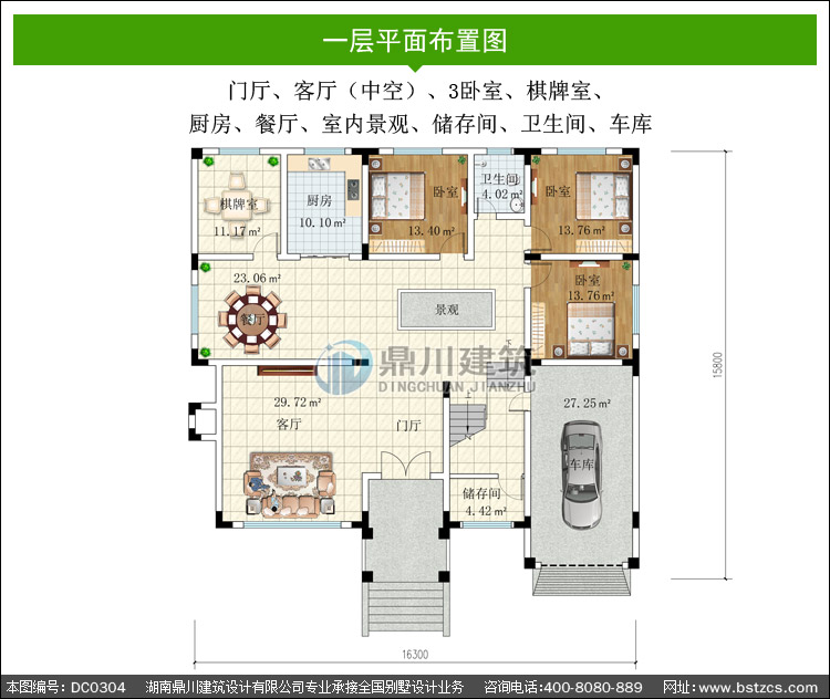 一 層: | 門廳、客廳(中空)、3臥室、棋牌室、廚房、餐廳、室內景觀、儲存間、衛生間、車庫 | |||