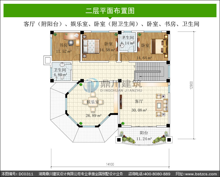 二 層: | 客廳(附陽臺)、娛樂室、臥室(附衛(wèi)生間)、臥室、書房、衛(wèi)生間 |
