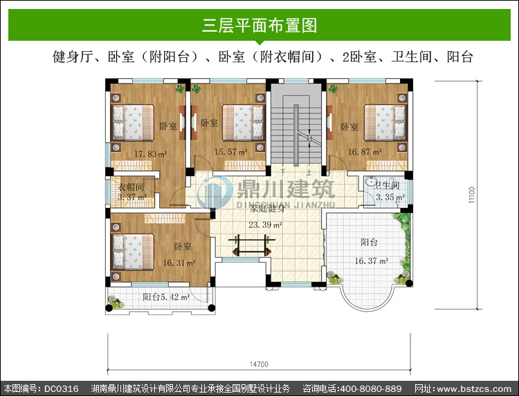 三 層: 健身廳、臥室(附陽臺)、臥室(附衣帽間)、2臥室、衛生間、陽臺