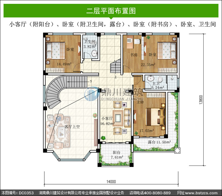二 層: | 小客廳(附陽臺)、臥室(附衛(wèi)生間,露臺)、臥室(附書房)、臥室、衛(wèi)生間 | |||