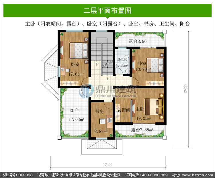 二 層: | 主臥(附衣帽間,露臺)、臥室(附露臺)、臥室、書房、衛生間、陽臺 |