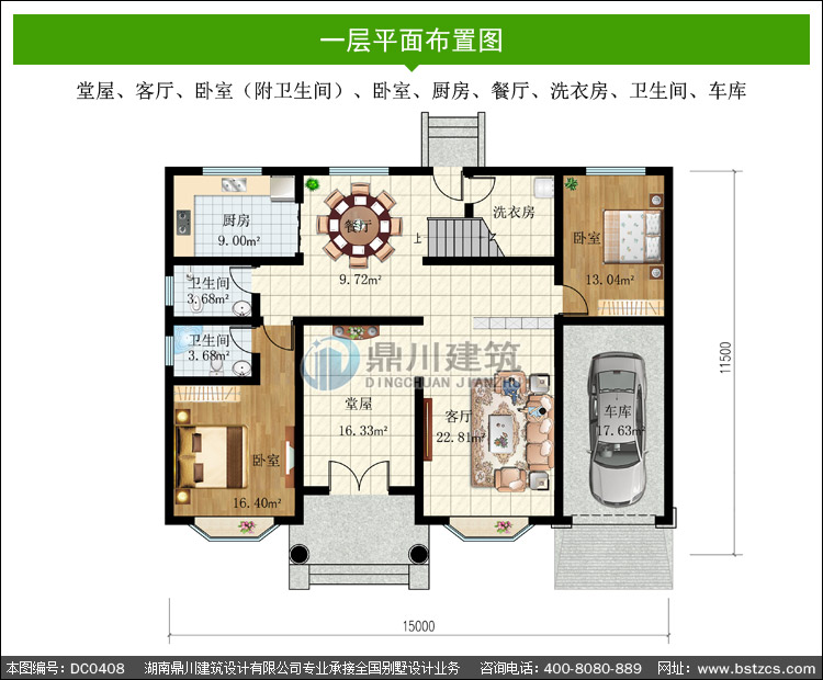 一 層: | 堂屋、客廳、臥室(附衛生間)、臥室、廚房、餐廳、洗衣房、衛生間、車庫 | |||