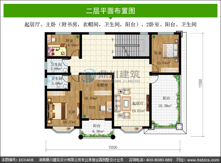 二 層: | 起居廳、主臥(附書房,衣帽間,衛生間,陽臺)、2臥室、陽臺、衛生間 | |||
