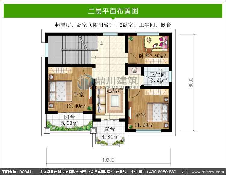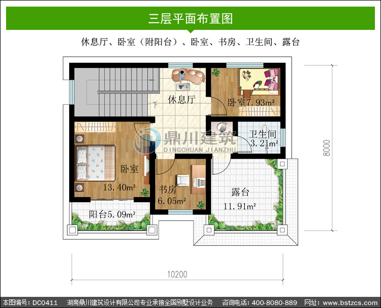 三 層: | 休息廳、臥室(附陽臺)、臥室、書房、衛(wèi)生間、露臺 |