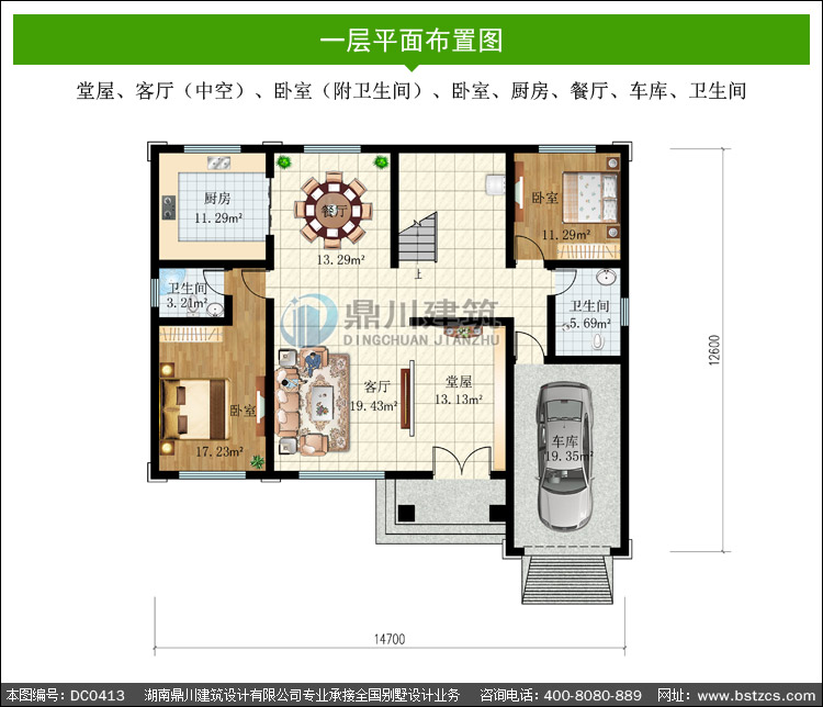 一 層: | 堂屋、客廳(中空)、臥室(附衛生間)、臥室、廚房、餐 廳、車庫、衛生間 | |||