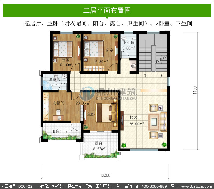 二 層: | 起居廳、主臥(附衣帽間、陽臺、露臺、衛(wèi)生間)、2臥室 、衛(wèi)生間 | |||