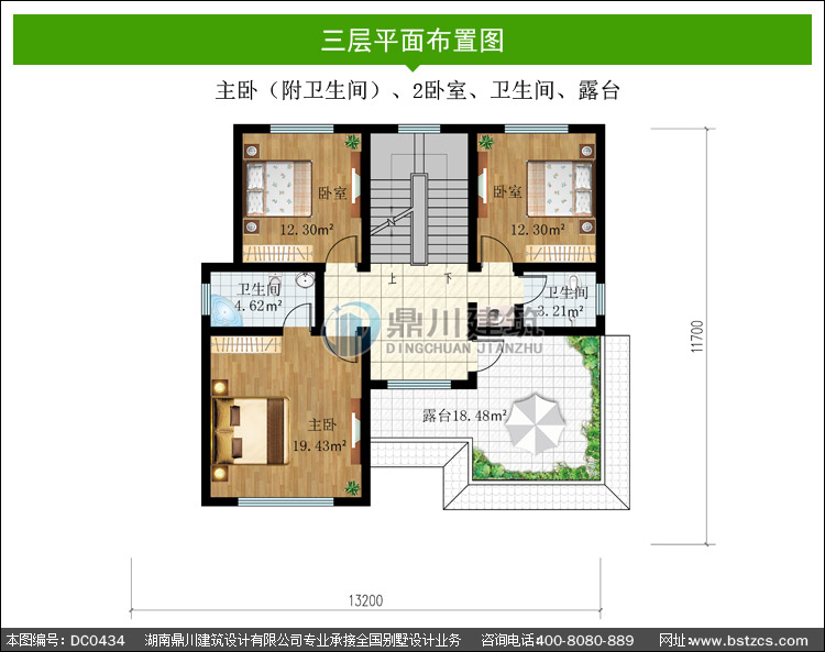 三 層: | 主臥(附衛生間)、2臥室、衛生間、露臺 |