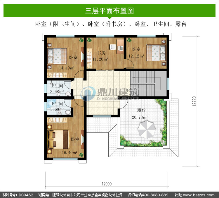 三 層: | 臥室(附衛(wèi)生間)、臥室(附書房)、臥室、衛(wèi)生間、露臺 |