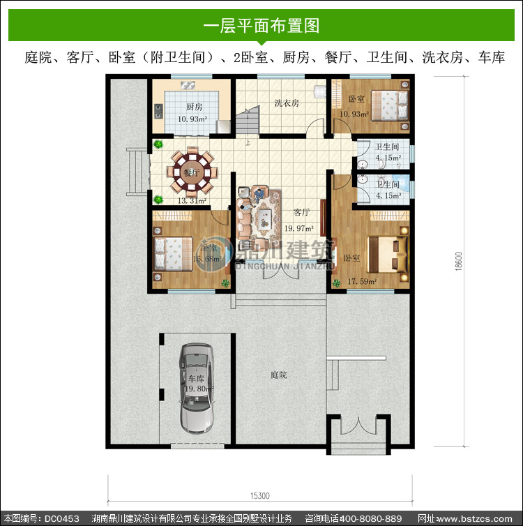 一 層: | 庭院、客廳、臥室(附衛生間)、2臥室、廚房、餐廳、衛 生間、洗衣房、車庫 | |||