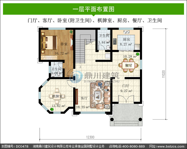 一 層: 門廳、客廳、臥室(附衛生間)、棋牌室、廚房、餐廳、衛生間