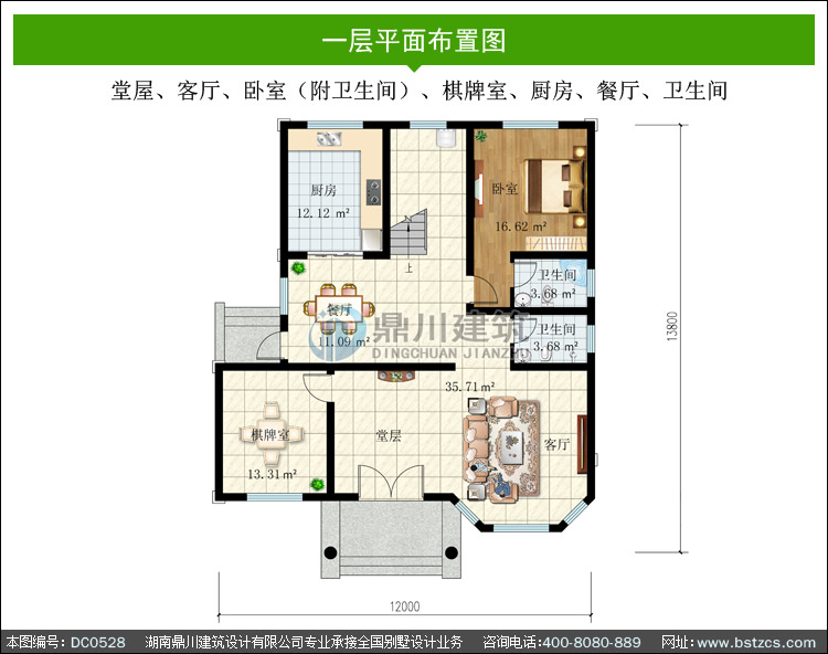 一 層: | 堂屋、客廳、臥室(附衛生間)、棋牌室、廚房、餐廳、衛生間 | |||