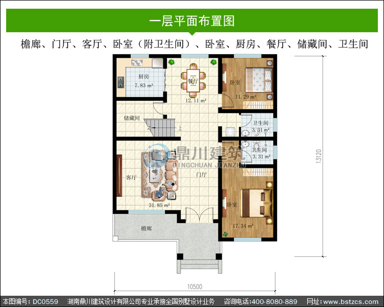 一 層: | 檐廊、門廳、客廳、臥室(附衛生間)、臥室、廚房、餐廳、儲藏間、衛生間 | |||